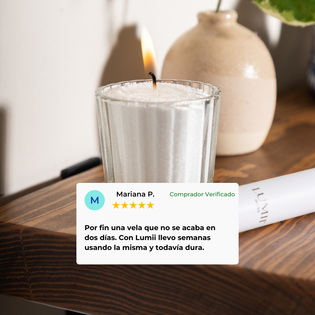 LUMII® se consume más lentamente que las velas tradicionales y ofrece hasta 250 horas de duración, 2 veces más que las velas tradicionales.